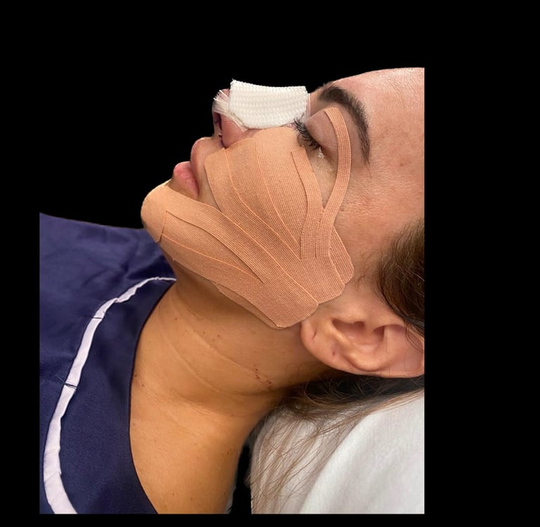 Após toda a remodelação da infraestrutura nasal, a pele é reposicionada de forma definitiva sobre o novo formato do nariz e as incisões são fechadas com suturas delicadas. Aplicamos tiras de micropore e uma tala termomoldável para minimizar o edema e ajudar a manter o novo formato enquanto o nariz cicatriza.